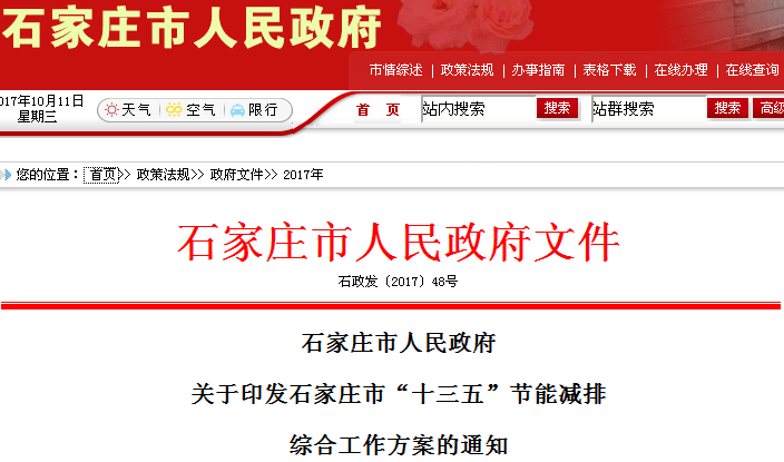 关于印发石家庄市“十三五”节能减排综合工作方案的通知